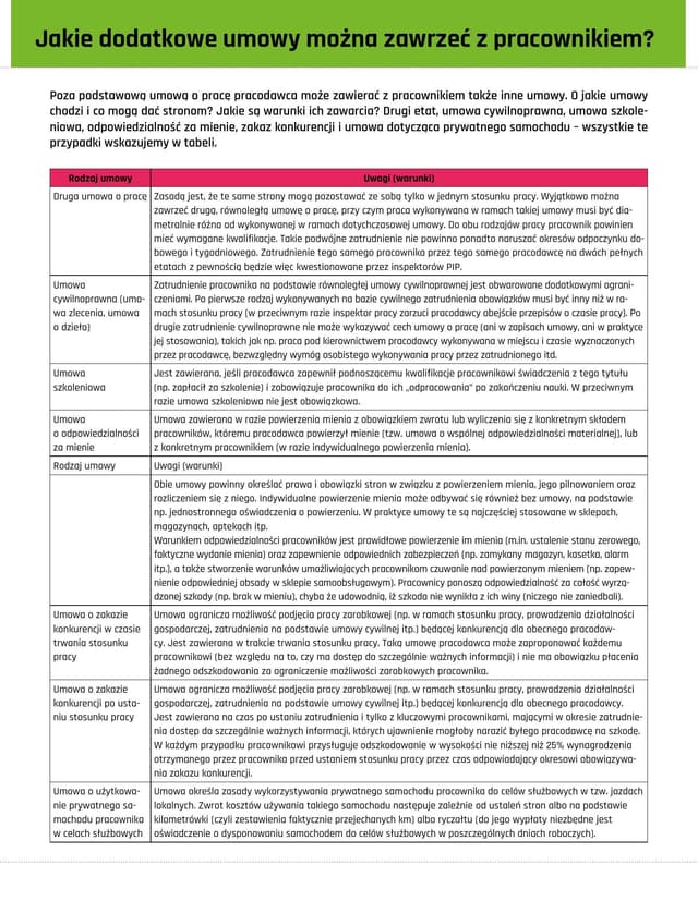 Poza podstawową umową o pracę pracodawca może zawierać z pracownikiem także inne umowy. O jakie umowy chodzi i co mogą dać stronom? Jakie są warunki ich zawarcia? Drugi etat, umowa cywilnoprawna, umowa szkoleniowa, odpowiedzialność za mienie, zakaz konkurencji i umowa dotycząca prywatnego samochodu – wszystkie te przypadki wskazujemy w tabeli.